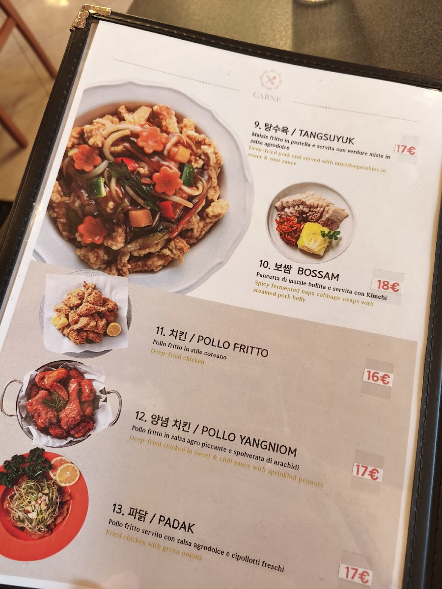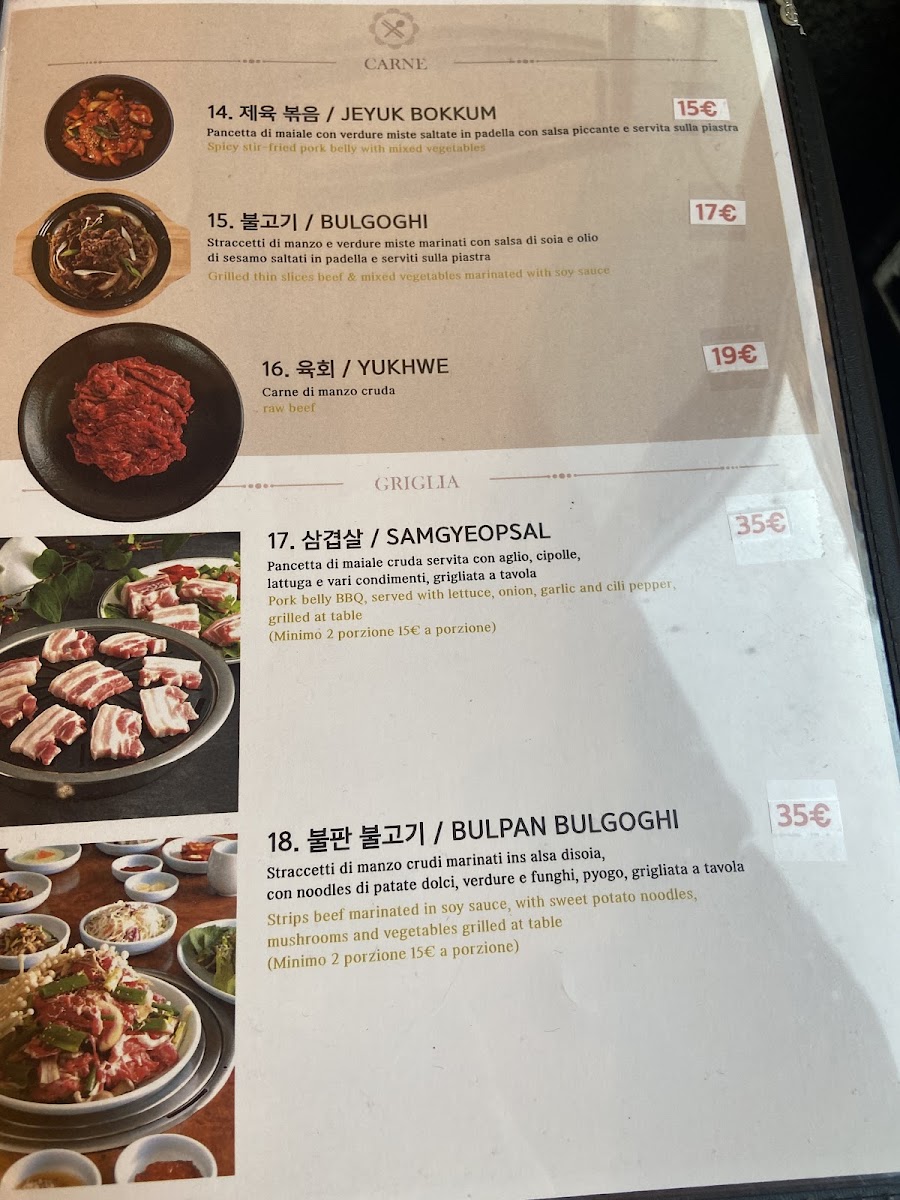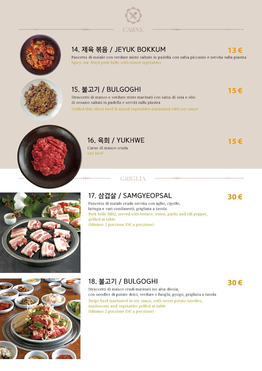 The menu at Hancook Ristorante Coreano Roma offers a diverse selection of traditional Korean dishes that cater to various tastes. Among the standout offerings is Bulgogi (marinated beef), a flavorful dish that blends tender meat with a rich, slightly sweet sauce. For those seeking something more savory, Kimchi Jjigae (kimchi stew) is a comforting choice, packed with spice and depth. The restaurant also offers several types of Banchan (side dishes), which change daily, giving guests a true taste of Korean home cooking. Their Bibimbap (mixed rice with vegetables, egg, and optional meat) is a well-loved classic, perfect for a light yet filling meal. A special mention goes to the Samgyeopsal (grilled pork belly), a popular choice for those craving a fun, interactive dining experience, as the meat is grilled right at the table. Prices are reasonable, with most dishes ranging from €15 to €20, making it an excellent option for those seeking authentic Korean flavors in the heart of Rome.
