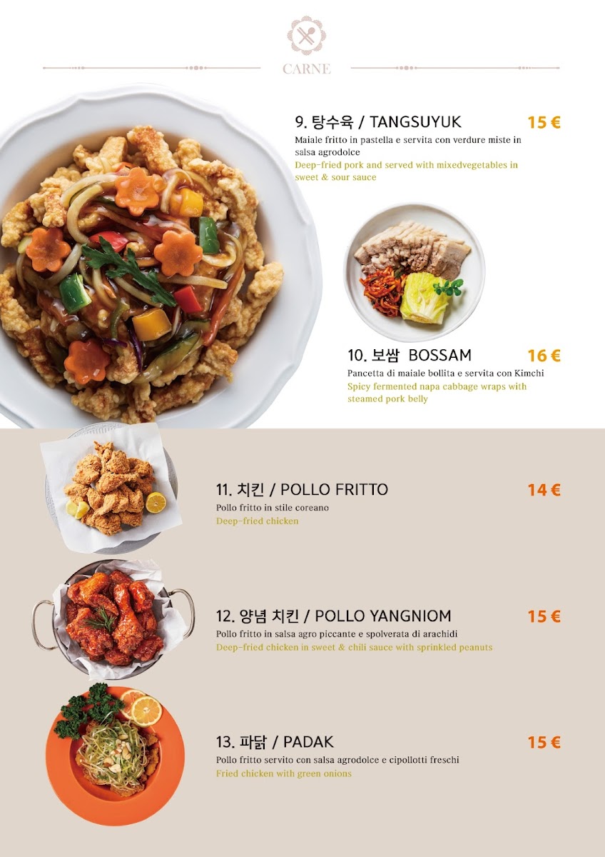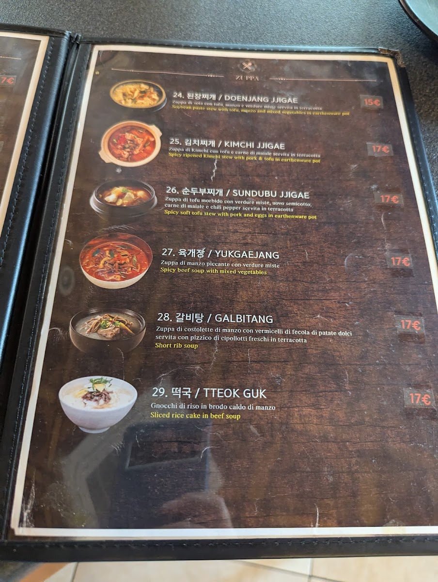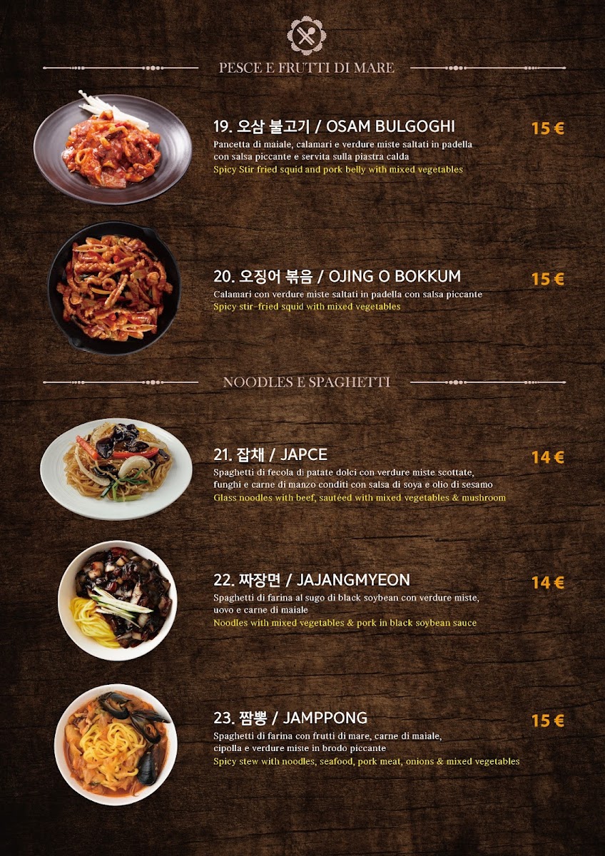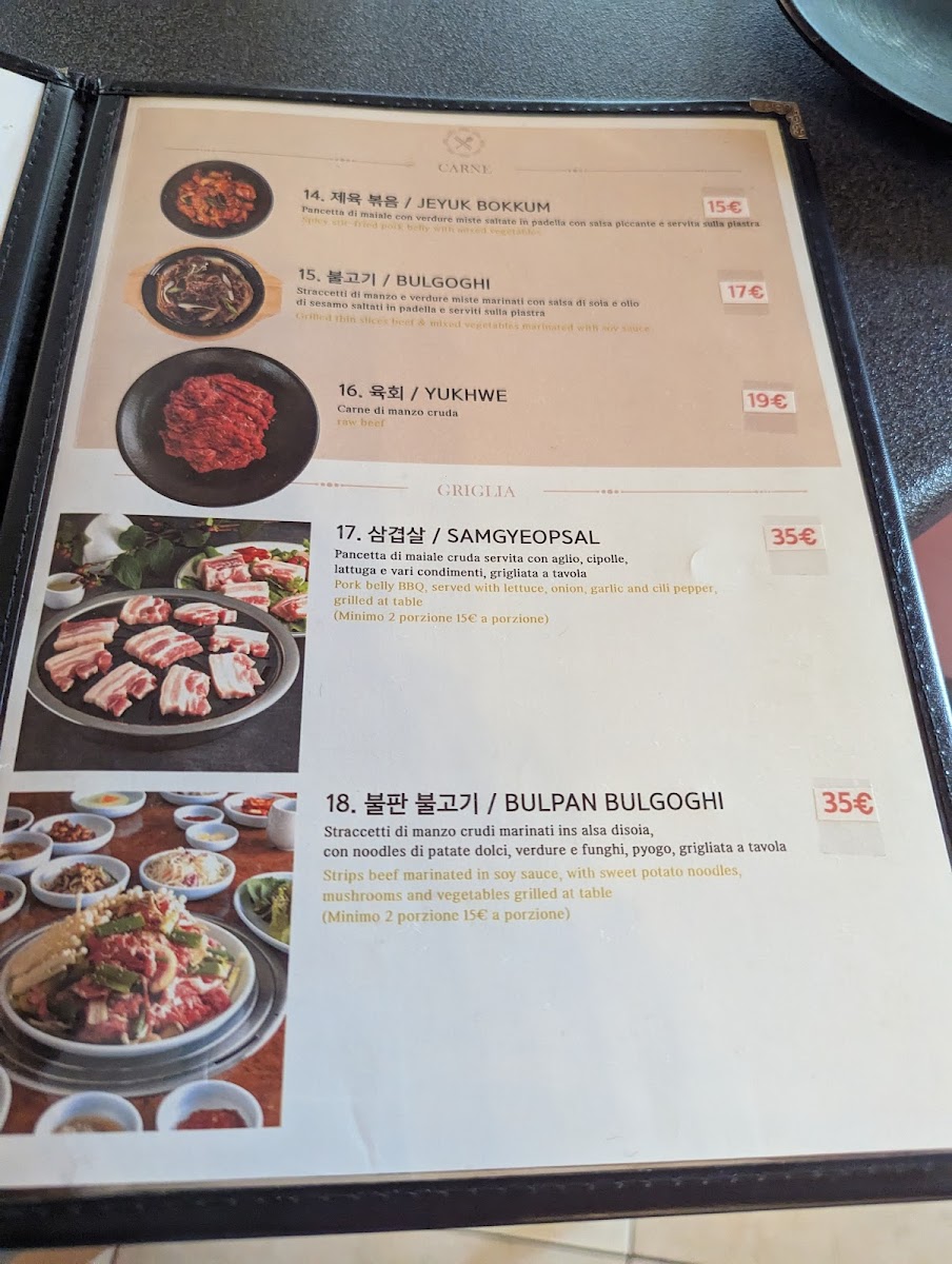 The menu at Hancook Ristorante Coreano Roma offers a diverse selection of traditional Korean dishes that cater to various tastes. Among the standout offerings is Bulgogi (marinated beef), a flavorful dish that blends tender meat with a rich, slightly sweet sauce. For those seeking something more savory, Kimchi Jjigae (kimchi stew) is a comforting choice, packed with spice and depth. The restaurant also offers several types of Banchan (side dishes), which change daily, giving guests a true taste of Korean home cooking. Their Bibimbap (mixed rice with vegetables, egg, and optional meat) is a well-loved classic, perfect for a light yet filling meal. A special mention goes to the Samgyeopsal (grilled pork belly), a popular choice for those craving a fun, interactive dining experience, as the meat is grilled right at the table. Prices are reasonable, with most dishes ranging from €15 to €20, making it an excellent option for those seeking authentic Korean flavors in the heart of Rome.